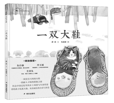 值得一提的是,《一雙大鞋》是明天出版社“我的山野中國”圖畫書系列之一,單從這本書來看,“我的山野中國”圖畫書系列不僅在自然的山野,與之相連的更有生活的山野與心靈的山野。當(dāng)下兒童的生活日益城市化,與自然世界存在諸多隔膜,那么在不太能回歸自然山野的大背景下,通過閱讀這些故事,通過品味故事里的人生,多增閱歷多長見識,領(lǐng)悟一些關(guān)于山野的生活智慧,在心靈之中葆有山野的清新靈動,終究是一件幸福的事情。