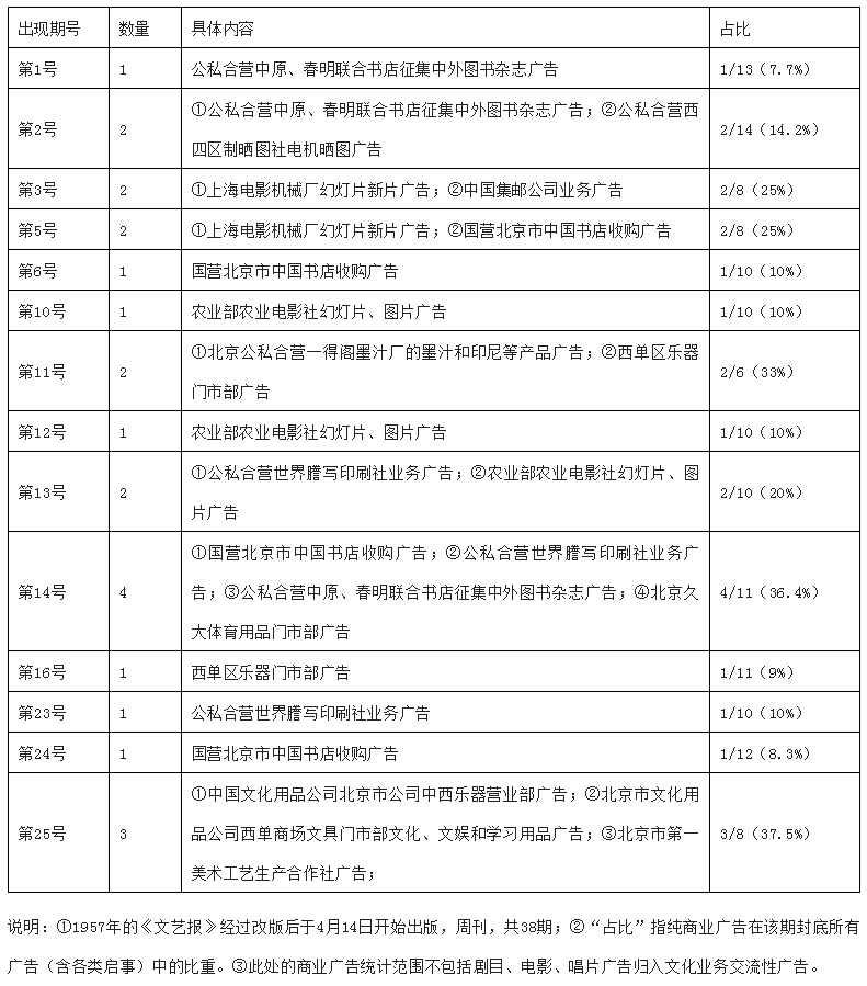不過,此時期最值得注意的是1957年的《文藝報》,它不僅在封底頁連續、大量、密集地刊發各類期刊、圖書廣告、劇目廣告、電影廣告、唱片廣告以及工業類、體育類期刊廣告和一些征求啟事,還刊發了數量和頻次都很可觀的商業廣告(見下表)。《文藝報》1957年共出版38期,刊發有純商業廣告的共有14期,占比36.8%,超過三分之一,其中刊發最多的為第14號,同時刊載商業廣告4種,刊發比重最多為第25號,占該期所刊廣告的37.5%。該刊第2號刊載了《<文藝報>廣告欄啟事》說明其所經營的廣告業務范圍,第5號和第6號刊發的啟事則除了廣告業務范圍還刊載了具體的廣告價目。從刊例中可以看到,《文藝報》接收的廣告范圍分為書刊廣告、電影和戲劇預告、文教用品三類,接收的廣告業務分為單色和雙色,其中電影和戲劇預告廣告價格最便宜,為單色1元/欄/行,雙色1.5元/欄/行,文教用品廣告最貴,為單色2元/欄/行,雙色2.5元/欄/行,書刊廣告居中。就《文藝報》具體刊發的廣告而言,文教用品廣告實際上就是純商業廣告,所以廣告費也更高,它們和文學的關系最遠,如集郵公司的廣告、樂器廣告、工藝生產廣告等,可見此時廣告活動包容性還很強的,業務范圍也比較廣。