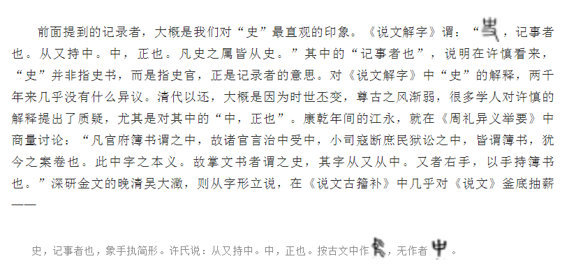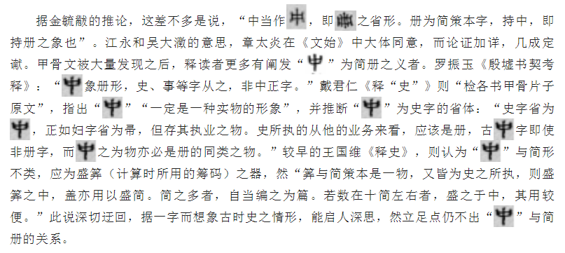 這個崩潰和重建的過程,傳統經典系統的圈定范圍桶底脫落,精心述作過的有周一代文化不再是唯一選擇,原先被經典封存的能量持續涌出,此前不夠雅馴的文化就此有了新的意義。對“史”字的解釋,便也逐漸離開了此前的“記事者也”范圍,向具體事務和神明祭祀兩個方向擴展。1960年代,屈萬里在審閱一篇文章時表示:“史字上半所從之□(按,‘之’后有一空格,疑有脫字,似應為‘圖片’上之‘圖片’),絕非簡冊之形。因冊字習見于甲骨文及金文,絕無作圖片者(甲骨文往往以‘史’為‘事’)?!?980年代初,胡淀咸的《釋史》一文,考察多種甲骨和金文,確立了史與事之間的關系:“‘史’和‘事’,原就是一個字。所謂史官實是任事之官,史、御史、大史、卿史都是由它所執掌的事務而得名的?!睆倪@個方向看,史與事的貫通,正是高層文化跟具體事務的溝通——或許在起始的時候,史官就并非一直高居廟堂,秉持著抽象的中正之德,目光如炬,執簡運筆——那些經典系統中致力于精神層面的人,在更深的意義上,一直就沒有脫離基礎性的勞作與時日。