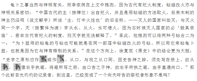不止庶事,仔細推敲起來,恐怕連神明祭祀之事,也無法離開具體的勞作。勞榦大概就是發現了其間的關聯,在《史字的結構及史官的原始職務》中,他便認定史的起源與弓鉆有關:“在史字中其所從的圖片就是一個弓背向下的弓形,金文及甲骨凡從弓的字,弓都是對側面的,這都是射箭的弓,只有這個弓形的弓背向下,對于弓鉆的形狀,正皆符合。”手持弓鉆的史,主要是鉆燧改火和攻治龜甲。鉆燧不消說需要弓鉆,攻治龜甲其實也在所難免:“龜甲是比較堅硬的,為求得卜兆先要在預備灼火之處,把它刮薄,因為硬難以刮薄,因此便先鉆,然后在鉆處再用鑿擴大?!比绱耸稚嫌芯唧w之事的史,當然不會跟抽象的中正無關。王國維《釋史》云,“中正,無形之物德,非可手持”。李宗侗《史官制度——附論對傳統之尊重》承接此義,分析鞭辟入里:“中正是表示無形的物件;而最初的人所表示的物品多半是有形的。所以不可能以手持無形的物,這是不合于古人的思想的。”