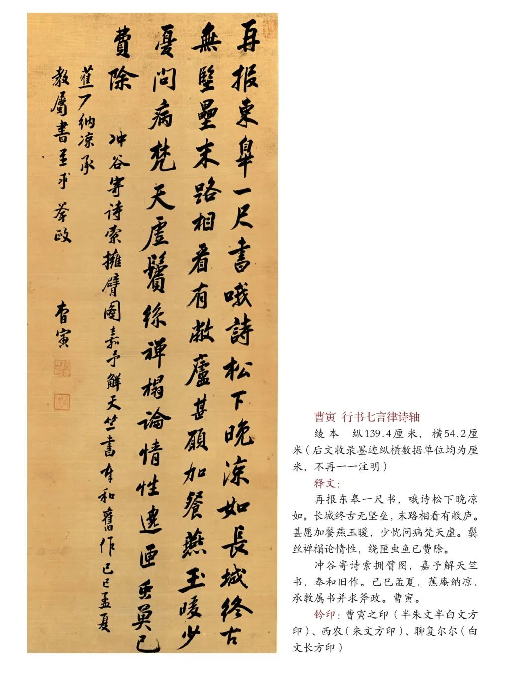 最后要談的就是本書所收錄的由田家英早年收藏的曹寅手書詩軸《沖谷寄詩索擁臂圖,嘉予解天竺書》。原詩分為兩首共八句、十六行,《楝亭集》“楝亭詩鈔卷一”收錄。或因條幅所限只書寫了前一首,因前文已述(見《觀其所藏知其所養——田家英與〈紅樓夢〉》),這里不再贅言。