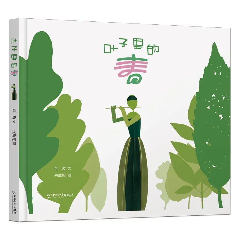“笛聲悠揚呼喚立春,琵琶弦弦彈奏雨水,鼓聲陣陣大地驚蟄,提琴緩緩春分來臨……詩歌和畫面時而重合時而平行,讓作品產生了一種流動的音樂感。”《葉子里的春》由著名詩人、兒童文學作家金波和著名圖畫書作家、插畫家朱成梁共同創作,以葉子為素材,組合成眾多新的形象,講述了一個關于樹葉、音樂、節氣和春姑娘的故事。
