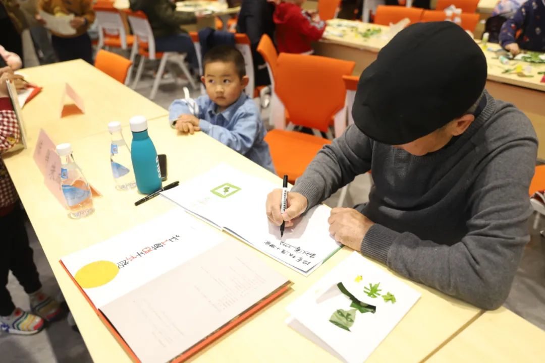 活動現場,有70組親子家庭參與到葉子畫的創作互動中,朱成梁老師為每一位小讀者簽名作畫,合影留念。