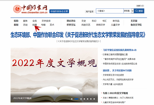 1、首先登錄中國作家網http://www.8bwg.com/ 在首頁頂端頻道分類位置找到“投稿”(標紅色箭頭處),點擊進入原創頻道。