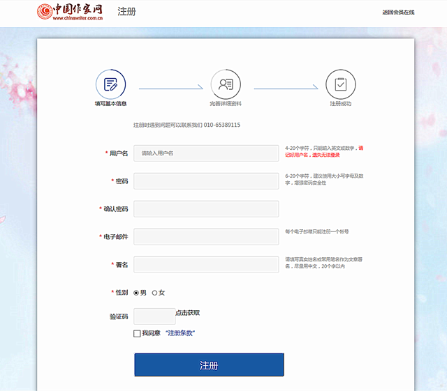 3、在注冊頁面按照右側文字提示準確填寫帶星號的各項基本信息,點擊“注冊”按鈕提交,并完善簡介等詳細資料后等待資格審核,審核周期一般為5個左右工作日。內刊注冊用戶資料填寫區別于個人注冊用戶,請著重注意“署名”需填寫內刊名稱,如:《XX雜志》;“簡介”需填寫對內刊基本情況的簡要介紹;上傳頭像為內刊近期封面;電話、郵箱等填寫內刊負責人(聯系人)聯絡信息。待審核通過成為本網內刊注冊用戶,方可登錄空間,上傳作品。
