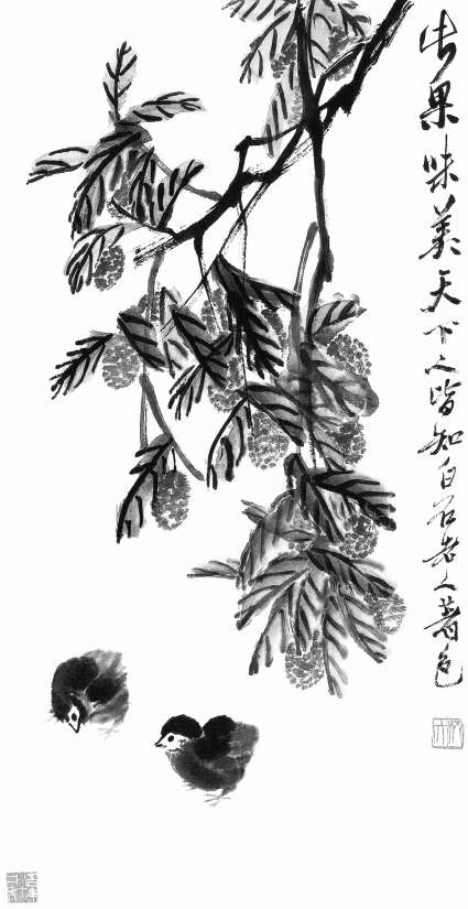 近代畫家齊白石也常畫荔枝,曾云:“牡丹為花之王,荔枝為果之王,白菜為菜之王”,由此可以看出齊白石對荔枝的偏愛。齊白石還寫有《荔枝詩》:“丹砂點上溪藤紙,香滿筠籃清露滋。果類自當推第一,世間尤有昔人知。”齊白石晚年的荔枝畫用色艷麗,筆力雄健,形成鮮明的個人風格。他繪有一幅《荔枝小雞》。畫面中,幾枝成熟的荔枝從右上角傾斜而下,占據畫面主體,兩只毛茸茸的小雞站立在荔枝果下,惦念著空中鮮艷可口的美食。畫家用干筆重墨寫出荔枝主干,用筆蒼厚古樸,有篆書筆意。畫樹葉時,畫家毛筆筆肚上水分較多,寫出來的葉片含水量較大,水分和色彩融合氤氳,使得葉子生機勃勃、翠綠欲滴。鮮艷的荔枝果實掩映在樹葉下,像是一位位含羞的美人。兩只小雞身上的墨色變化豐富,淡墨在宣紙上洇開的痕跡恰似小雞的絨毛。畫家寥寥數筆勾勒出小雞的身體結構,生動傳神。