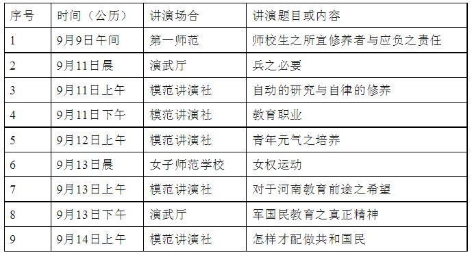 綜合以上考證,1922年9月9日至14日,在汴期間梁啟超至少發(fā)表九次演說,為直觀呈現(xiàn),可列表如下: