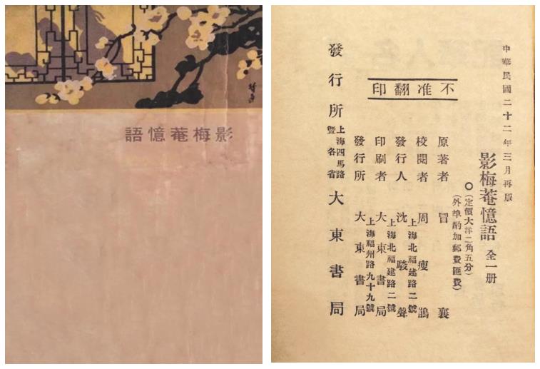 唐弢藏書《影梅庵憶語》(上海大東書局,民國二十二年再版本)封面及版權頁