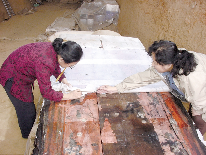 王亞蓉和首都博物館的同事對老山漢墓出土的絲織品進行揭取
