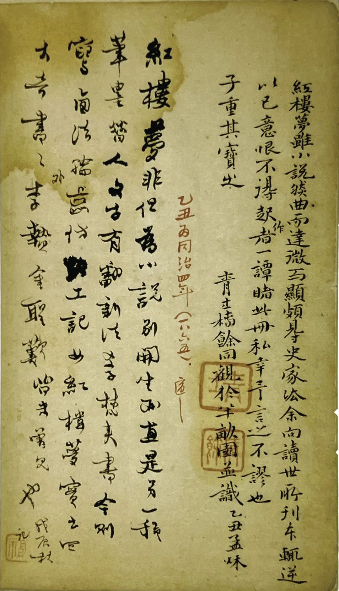 書后有許多題跋,其中一跋云:“紅樓夢非但為小說別開生面,直是另一種筆墨……紅樓夢實出四大奇書之外,李贄、金圣嘆皆未曾見也。戊辰秋記”。鈐印“福”。“福”即為原藏者劉銓福。胡適有眉批:大興劉銓福,字子重,是北京藏書家。他最初跋此本在同治二年癸亥(1863),五月廿七日跋,當在同年。他最后跋在戊辰,為同治七年(1868)。劉銓福和父親劉寬夫都是藏書家。葉昌熾在《藏書記事詩》有記:“河間君子館磚館,廠肆孫公園后園。月老新書紫云韻,長歌聊為續梅邨。”講的就是劉氏父子的事。劉氏因得河間獻王“君子館磚”,名其居“君子館磚館”,又曰“磚袒齋”,所居即孫承澤故宅“園后園”。
