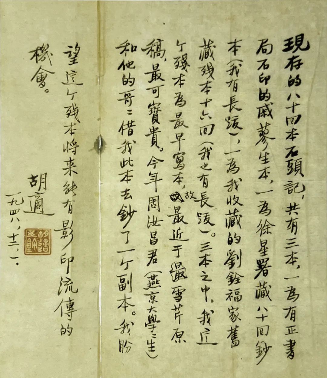 胡適還有一則長跋,“現存八十回本石頭記,共有三本,一本為有正書局石印戚蓼生本,一為徐星署藏八十回鈔本,我有長跋,一為我收藏的劉銓福家舊藏本十六回(我也有長跋)。三本之中,我這個殘本為最早寫本,故最近于曹雪芹原稿,最可寶貴。今年周汝昌君(燕京大學學生)和他的哥哥借我此本鈔了一個副本。我盼望這個殘本將來能有影印流傳的機會。胡適,一九四八、十二、一。”