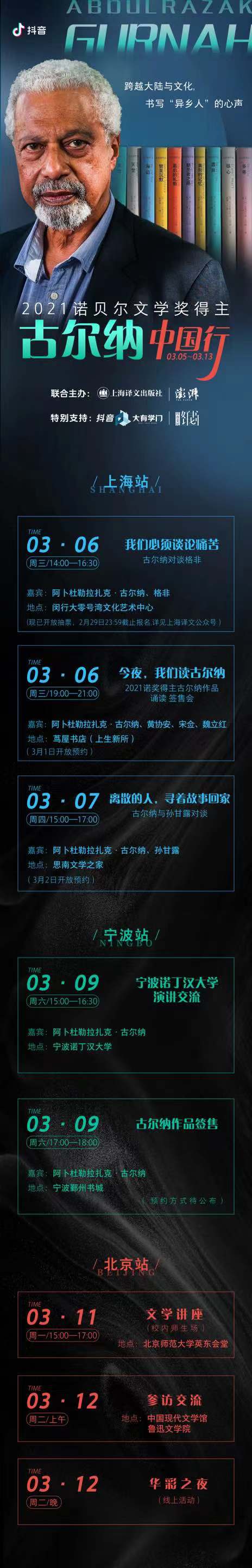 2021年諾貝爾文學獎得主阿卜杜勒拉扎克·古爾納將于今年3月初首次訪問中國,在上海、寧波與北京三地展開多場文學與文化交流活動。