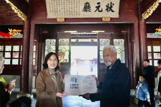 3月9日,諾貝爾文學(xué)獎(jiǎng)得主古爾納攜夫人來(lái)到了寧波天一閣。從范欽銅像到東明草堂,從天一閣藏書(shū)樓到秦氏支祠戲臺(tái),古爾納夫婦感受了寧波獨(dú)有的“書(shū)藏古今”。聽(tīng)聞自己是參觀天一閣的第一位諾獎(jiǎng)得主,古爾納表示高興,還說(shuō):“Many thanks for a wonderful visit(非常感謝這一段美好的旅程)。”