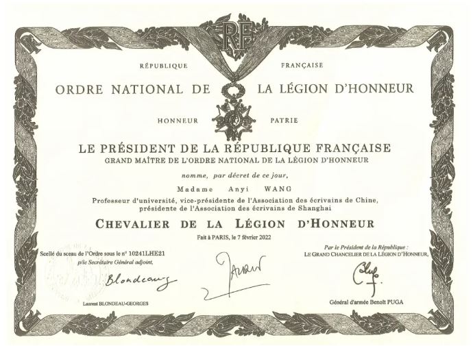 5月24日中午,中國作家王安憶在上海被授予法蘭西共和國榮譽軍團騎士勛章,并接過了由法國總統馬克龍簽發的榮譽證書。法國駐華大使白玉堂先生致辭并代表法國政府授予王安憶勛章。今年是中法建交60周年。法國政府不僅肯定王安憶的文學成就,也肯定了王安憶對中法文化和文學交流作出的杰出貢獻。