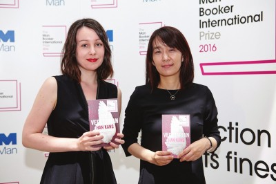 憑著英譯小說《素食主義者》,年輕的韓國語翻譯家德博拉·史密斯(左)和作家韓江分享了2016年的布克國際獎。賈妮·艾雷攝影,布克獎基金會圖片