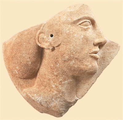 走進展廳,首先映入眼簾的是一塊大理石女性頭像浮雕圓盤殘片。它來自米洛斯島,年代約為公元前460年—前450年,圓盤上刻畫的女性可能是古希臘神話中的美神阿佛洛狄忒。她濃密的頭發束成一個髻,露出修長的脖頸,散發著優雅之美。