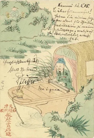 手繪明信片誕生在這個“機械復制”為時髦的時代,顯然是不合時宜的。實用品以人工繪制,耗時又費力,但附著于郵政明信片,反倒是舊瓶裝新酒,是一種深入淺出的新玩意兒,在對東方抱有獵奇心態的使用者,也就是那些來華洋人看來,明信片不費巨資,卻難得手工定制,不僅別出心裁,品位還不凡,值得向遠方的親人炫耀。