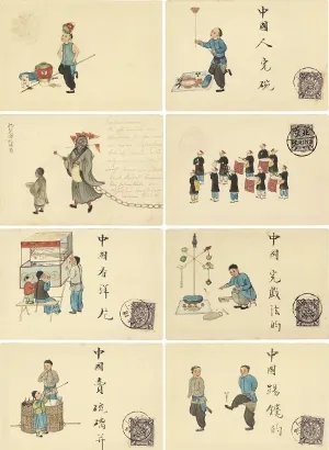 因此,那些帶有異國風情的市井圖,便格外受到歡迎:頂缸、玩碗、修傘、當鋪、夜巡、舞龍、逗貓、釘馬掌、西瓜攤、?;鹎?、蕩秋千、僧人化緣、童子樂隊、婦女吸煙、龜奴馭妓、鼓弦說唱、冰床運客、冬日堆雪獅子等等,三教九流,五花八門,煙火氣十足,仿佛是“晚清上河圖”的“蒙太奇”。在一組二十枚民俗套片中,還赫然寫上“中國人玩碗”“中國人看洋片”“中國人玩戲法”“中國人踢毽子”“中國瞎子”的書法。對畫者來說,這些現象司空見慣,用不了多此一舉,所以以“中國人”為前綴,等于為奇異事物注解,簡單粗暴的背后,正是殖民主義者的觀看欲望,實在忍不住大驚小怪。