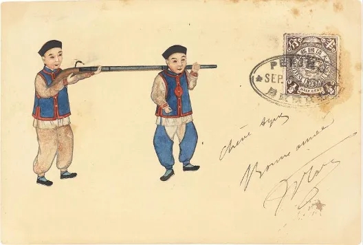 清二次片雙片之回片,周培春繪《抬槍射擊圖》,郵路:清代二次片雙片對折裁開后使用。此片雖有書寫收信地址,其實并未實寄。上有北京郵政局1901年9月6日之橢圓戳,為集郵性質蓋銷