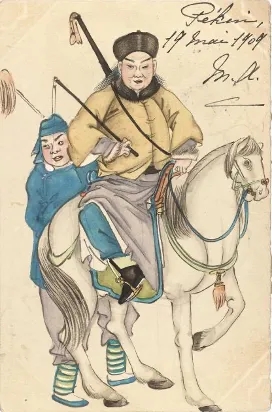 以唯一可鑒的北京畫家周培春為例,或許便是這種情況。他畫過《滿清文武官員品級圖冊》(現藏大都會博物館),也畫過《清代商鋪招牌幌子圖》,這些組畫是清宮一種工具式繪畫類型,畫法不求藝術性,照實描摹足矣,以標準圖鑒樣式歸入內府檔案。細看周培春嚴謹細致的畫功,他極有可能原先乞食宮中,因而對文武大臣的服飾舉止了如指掌,明信片便手繪出“此是六品武官”“此是頭品文官”“官員騎馬”等官場行狀,朝服品級制式準確無誤,還有“清兵試火槍”“雙人抬槍射擊”等軍情實錄,可見周培春所聞皆禁中所見,見識遠高于一般平民畫家。有趣的是,從明信片上的郵票、郵戳信息得知,委托者與畫面內容身份吻合,文有荷蘭領事館外交官,武有德國海軍軍官,顯然是向熟悉清廷內情的畫工特別定制的,在其他手繪明信片中,此類題材絕無僅有。