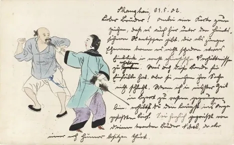 商行明信片《悍婦毆夫圖》,郵路:1902年5月23日上海德國客郵局收寄,6月30日抵達德國雷根斯堡(Regensburg)