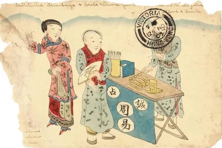 清二次片《算卦圖》,郵路:此片1907年陰歷10月16日福建福州寄出,11月24日在香港中轉后,12月27日到達德國城市