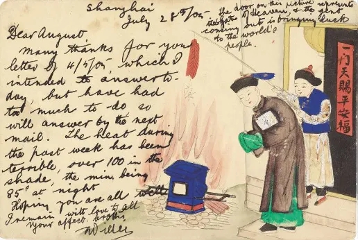 所以說,所有“合作”帶來的光暈,才是手繪明信片鮮活的靈魂。其中,文字與圖畫的互不設防,恰好等同于東方與西方的互不相認,正解也好,誤讀也罷,看起來都是生機。僅以幾件出自上海地區的明信片為例,“捕黑熊圖”屬于極簡式,只在囚熊的木枷上添上“1906”字樣,立馬產生一種“非現實”的寓意,是不是針對時局的惡意也未可知。相反的情緒,是一件“龜奴馭女圖”帶來的愉悅,本是滬上四馬路常見的風塵,頭頂上卻飄來“新年快樂”的手寫花體字,也不知這個德國人是否了解風化,便借此來向遠方的親人道賀。類似因誤解而產生喜感的例子,在手繪明信片中俯拾皆是。在一件清朝官員為了祭祀燒紙轎的明信片上,這位叫威爾的英國人告訴他的朋友,“這個紳士從天堂的大門里走出,帶給世界各地人們以好運”,真是好笑。其實呢,選擇這枚明信片的真實動機,猜想是看中了畫面上燃燒的火焰,因為寫信人覺得,“過去一周的高溫非??膳?,在陰涼處超過華氏一百度,夜間最低溫度為八十五度”,當然啦,同時也表達“我會一直愛著你”的熱情。