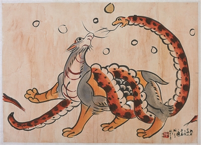 墓葬壁畫為了解古代社會提供了珍貴的圖像材料。礦物質(zhì)顏料繪制的壁畫顏色經(jīng)久不褪,畫中的蛇或出現(xiàn)在神話傳說場景里,或與人間煙火相伴,反映了古人豐富的想象力和精神信仰。山西忻州九原崗北朝壁畫墓中發(fā)現(xiàn)了鳥銜蛇和神獸銜蛇的圖案,象征著驅(qū)除升天途中的邪障,護佑墓主順利升天。《山海經(jīng)》記載:“大荒之中,有山名曰北極天柜,海水北注焉……又有神,銜蛇操蛇,其狀虎首人身,四蹄長肘,名曰強良。”銜蛇圖出現(xiàn)在墓葬中,也有鎮(zhèn)守墓室、庇護墓主人安寧的意義。山西右玉寶寧寺明代“大威德焰發(fā)德迦明王”水陸畫中的蛇形象與神佛相伴,庇佑人間。蛇在畫中不僅是一種裝飾,更體現(xiàn)了古人的精神寄托,希望借助蛇的神秘力量驅(qū)邪避災(zāi),保佑風調(diào)雨順、國泰民安。