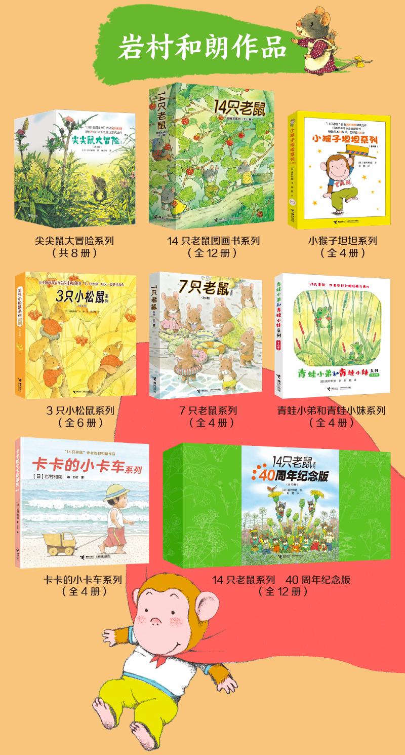 巖村和朗一生創作頗豐,著有“14只老鼠系列”“7只老鼠系列”“3只小松鼠系列”“小猴子坦坦系列”“卡卡的小卡車系列”等諸多經典作品。這些作品不僅在日本備受贊譽,還被翻譯成法、德、韓等多種文字,在國際上廣泛傳播,多次斬獲各類重要獎項。其中,《14只老鼠吃早餐》榮獲日本繪本獎,《14只老鼠挖山藥》《7只老鼠挖紅薯》榮獲小學館繪畫獎,《一個人的末班車》榮獲產經兒童出版文化獎,《愛思考的青蛙》獲講談社出版文化獎繪本獎。2014年,巖村和朗更是憑借其卓越成就,榮獲法蘭西藝術與文學勛章中的騎士勛位。