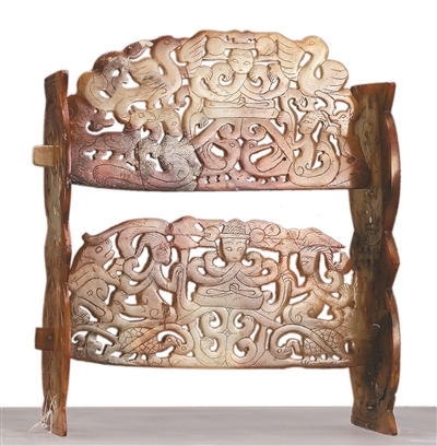 東漢透雕神仙故事玉座屏由4塊和田黃玉片插接而成,兩側支架為疊勝形,分別透雕青龍和白虎。中間兩屏片略呈半月形,兩端有榫插入架內,透雕神仙人物、祥禽瑞獸。上屏正中為西王母,分發高髻,憑幾端坐,旁有羽人、朱雀、九尾狐、三足烏等;下屏正中為東王公,發后梳,旁有羽人及熊、玄武等。玉屏風和座屏常見于記載,但考古出土的實物僅此一件,這也是考古發現的最早將人物、動物、景物合雕在一起的玉器,被列入《禁止出國(境)展覽文物目錄》。