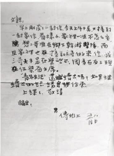 父親:早上剛發了一封信,今天上午十點,又接到一封家信。看樣子家里一準不怎么安(穩),想二哥準在鄉下干游擊隊,而且家里也接到三哥的來信。我三哥大半是在察哈爾,因為石友三現在任察省主席。“青年生活”還繼續出嗎?如果繼續出的話,請寄幾份來。上課了,敬請福安!