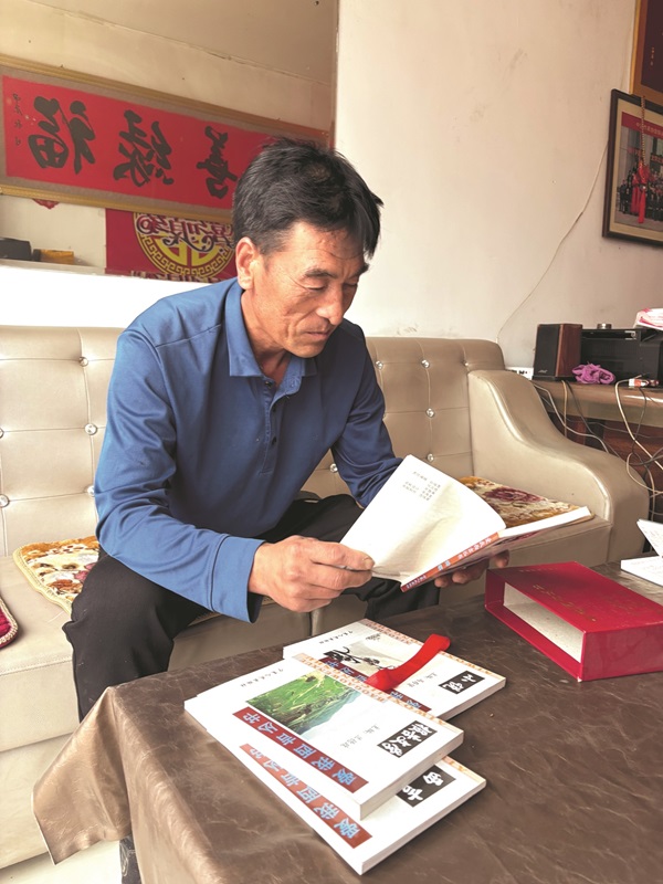 咸存福的家有一個(gè)四四方方的小院,院內(nèi)綠樹掩映。然而,步入略顯簡樸的客廳,屋內(nèi)的景象卻令人印象深刻。房間左側(cè),倚墻而立的是半面墻的書柜和一張書桌。桌上,一臺(tái)筆記本電腦的觸控板兩側(cè),被長期使用磨出了兩個(gè)極其醒目的油亮手印,無聲訴說著主人的勤奮。與之相對(duì)的房間右側(cè),一個(gè)書架上整齊陳列著從第一屆到第十屆的所有茅盾文學(xué)獎(jiǎng)獲獎(jiǎng)作品。面對(duì)記者,咸存福和他的父親咸順利分享了他們的故事。