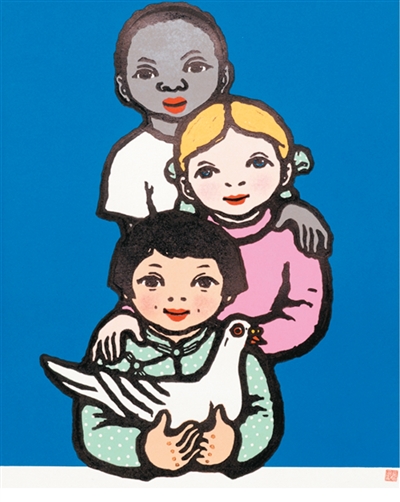 潘義奎《和平萬(wàn)年》通過(guò)寫實(shí)手法,塑造齊白石創(chuàng)作中的姿態(tài),白石老人神態(tài)莊重而不失自然,正以奔放的筆觸勾勒一只和平鴿。蔣兆和《小孩與鴿》則通過(guò)現(xiàn)實(shí)主義的表現(xiàn)手法,展現(xiàn)孩童與鴿子之間的天真互動(dòng)。這些作品都傳遞出人類對(duì)和平與幸福的期許。
