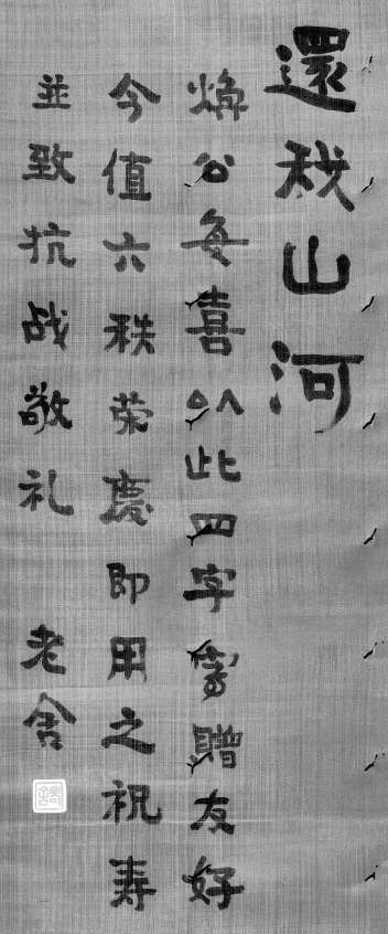 抗戰(zhàn)期間,馮玉祥將軍六十歲生日時,老舍書“還我山河”祝壽并致抗戰(zhàn)敬禮。