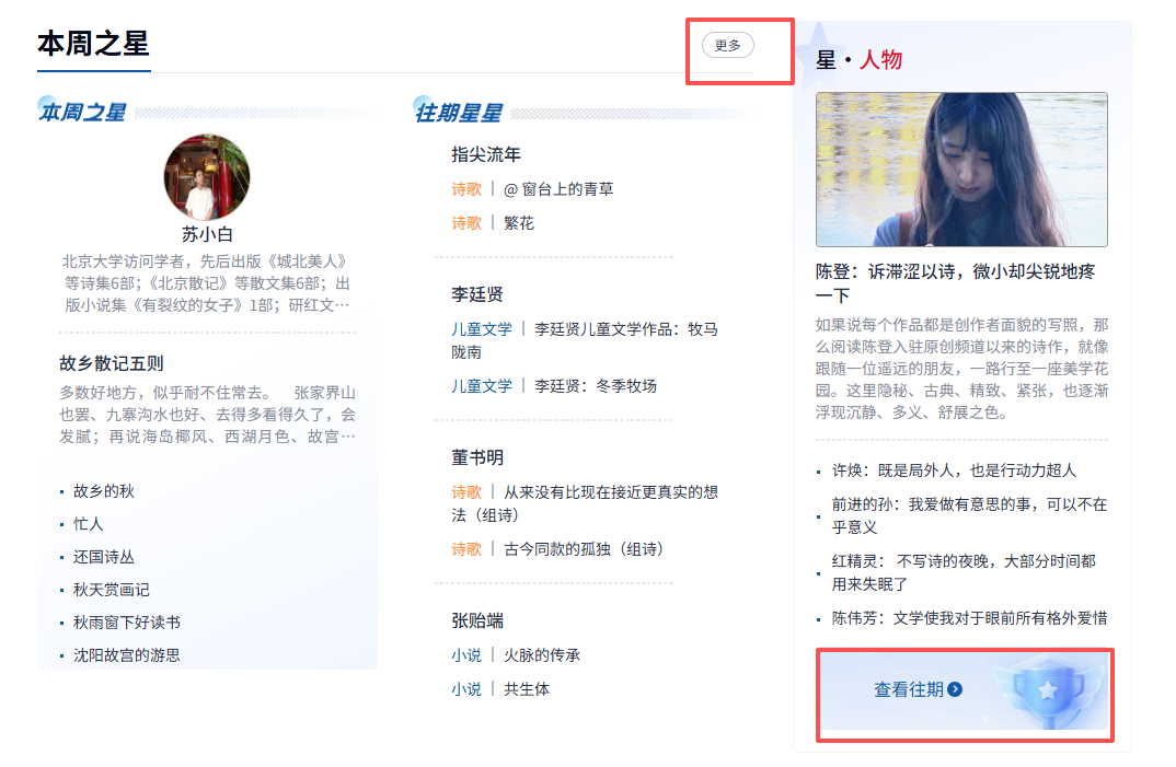 “本周之星”欄目的顯示內容則變得更加豐富了,除了當期的“本周之星”,也可以同步顯示往期的四位,點擊右上角“更多”進入“本周之星”列表頁,查看所有“本周之星”內容。
