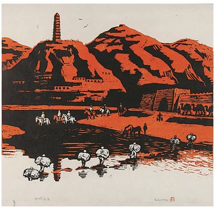 古安村:1991年底,古元被確診為癌癥晚期。20世紀(jì)90年代,古元不僅創(chuàng)作了一批黃河題材作品,還創(chuàng)作了一批駱駝?lì)}材作品。實(shí)際上,這些創(chuàng)作都是他在術(shù)后對(duì)人生和自我的重新審視。人生既有美好安靜的順流,也有異常艱難的逆流、漩渦和淺灘。在創(chuàng)作《激流勇進(jìn)》時(shí),古元已歷經(jīng)四次化療,身體極度虛弱。然而,他以頑強(qiáng)的意志力堅(jiān)持創(chuàng)作,通過描繪黃河漩渦與逆流而上的纖夫等意象,藝術(shù)化地傳達(dá)了其戰(zhàn)勝病魔的精神信念。此時(shí),他還創(chuàng)作了《西出陽(yáng)關(guān)》等駱駝?lì)}材作品,刻畫了駝隊(duì)在荒漠風(fēng)沙中艱難跋涉的視覺意象,同樣呈現(xiàn)出古元強(qiáng)烈的精神訴求。駱駝?lì)}材作品與黃河題材作品彼此呼應(yīng),共同體現(xiàn)了古元晚期創(chuàng)作中的生命哲學(xué)思考。駱駝堅(jiān)韌前行的精神、黃河激流勇進(jìn)的精神,不僅體現(xiàn)了古元個(gè)人的生命哲學(xué)思考,也升華為對(duì)民族精神與抗戰(zhàn)記憶的藝術(shù)詮釋。