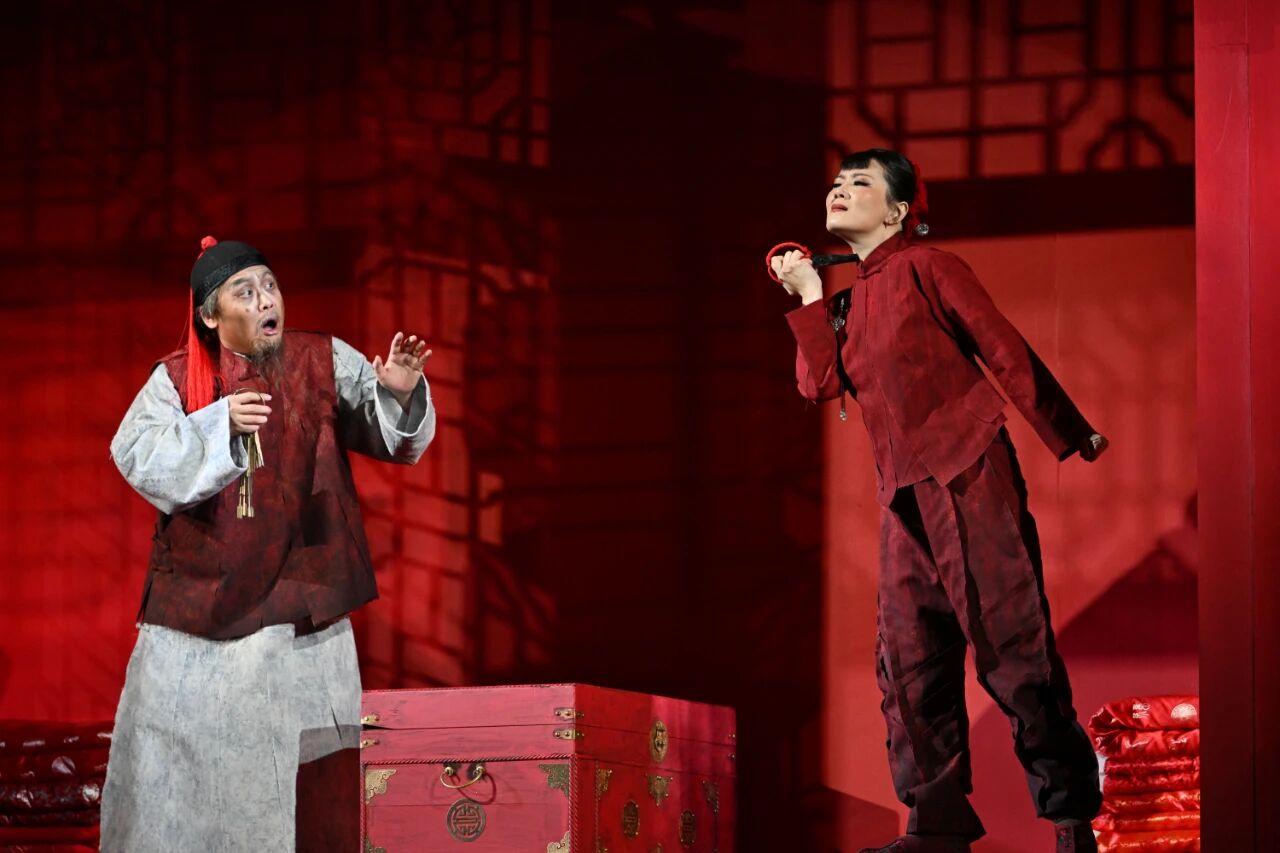 小說的線性敘事難以展現(xiàn)視覺與音樂切換所產(chǎn)生的巨大張力,而這正是歌劇藝術(shù)的魅力所在。在第二場中,一座精雕細琢的中式婚床成為舞臺核心,九兒身披紅嫁衣,靜坐于血色光影中,周遭的紅燈籠、錦緞鋪蓋,共同構(gòu)筑起一個華麗而壓抑的封建牢籠。當(dāng)患有肺癆的單扁郎踉蹌闖入,在婚床上展開一場追逐時,戲劇的荒誕感油然而生。他唱腔滑稽,強調(diào)“姻緣天定”;九兒的回擊則如驚雷,唱出“寧死不嫁漢奸”的決絕。二人風(fēng)格迥異的唱段形成尖銳對抗:單扁郎的唱腔帶著俚俗的狡黠,九兒的反擊則如山崩地裂。于是,婚床化身“戲臺”,上演著一場被圍觀的儀式。這種“臺中臺”的嵌套設(shè)計,極大地濃縮了沖突,讓個體的反抗在與環(huán)境、命運的對抗中,迸發(fā)出悲劇性的崇高感。更加震撼人心的,是緊隨其后的場景切換:舞臺從壓抑可怖的婚床轉(zhuǎn)變?yōu)闊o邊的高粱地。余占鰲與九兒在此深情重唱,那簡單的問答“這里就是家”,與先前場面形成天壤之別。情感如野火般掙脫所有束縛,使這片高粱地化作一場對生命、自由與愛最直接、最熱烈的禮贊。