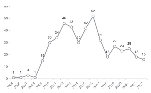 圖2:莫言作品的日本讀者評價數量趨勢(2008—2023)