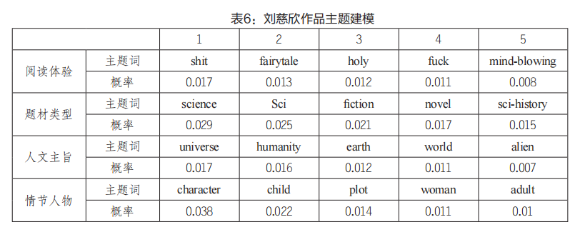 根據(jù)表6所示,劉慈欣的作品主題主要包括閱讀體驗、題材類型、人文主旨、情節(jié)人物、文化背景和翻譯技術等六個方面。讀者對劉慈欣作品的閱讀體驗既有積極評價也有消極評價,如主題中的正面詞匯“fairytale”“holy”“mind-blowing”,以及負面評價詞匯“shit”“fuck”,表明讀者對作品的評價和偏好存在主觀差異。其他的五個主題基本上是正面評價為主,劉慈欣作為中國科幻小說的代表,對海外讀者產(chǎn)生了強大的吸引力。主題詞中“world”“universe”“ sci-history”等主題詞反映了現(xiàn)實與科幻的關系,引發(fā)了讀者對地球的敬畏、對文明的思考等人文關懷,深受讀者喜愛。此外,“character”“plot”“civilization”“translation”等主題詞反映了小說中人物塑造的方式、文化背景、翻譯質(zhì)量等方面,體現(xiàn)了讀者對作品關注的視角。