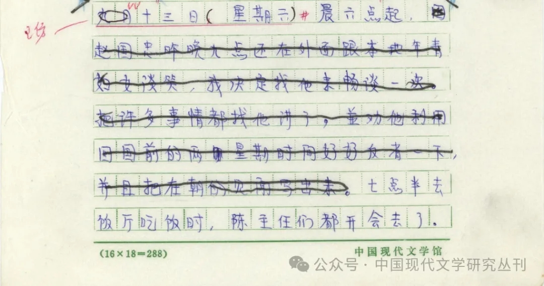 (2)1952年9月13日手稿為:“晨六點起,因趙國忠昨晚九點還在外面跟本地青年婦女談笑,我決定找他來暢談一次。把許多事情都對他講了,并勸他利用回國前的兩星期時間好好反省一下,并且把在朝的見聞寫出來。”抄稿本在校改中刪去句中有關趙國忠的內容,僅余“晨六點起”一句。