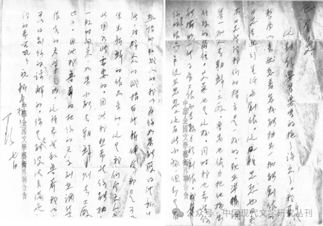 這封信要寫要寫的拖了許久了。我自從整風以來就想著怎樣抽出一批能創作的同志去進行生活和創作。這種思想也同喬木所給我們的指示是一樣的。現在準備調集一批人去朝鮮,工廠。……因此我極希望你能抽出一段時間來,如果不能去朝鮮,則去工廠也可。因此我魯莽的[地]把你的名字列在調集作家的名單之內,這種希望和魯莽我以為可以得到你的諒解的。你是否能設法來滿足我們的希望呢?[71]