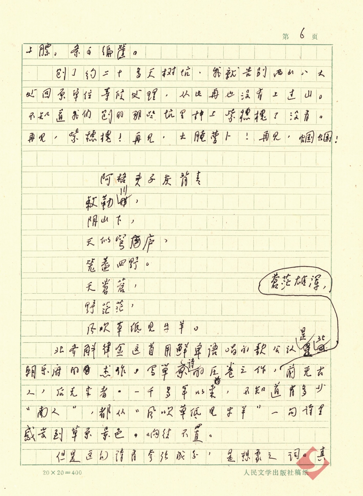 在《阿格頭子灰背青》的手稿中,他由壩上草原的牧草,聯想到了北齊名歌《敕勒歌》。原稿寫:“寫草原詩的壓卷之作,前無古人,后無來者。”想了想,又在“壓卷之作”之后添了四字——“蒼茫雄渾”。這四個字,讓整段文字忽然有了氣象。文學史的評價,忽而化作草原上的長風浩蕩。“蒼茫雄渾”,概括了《敕勒歌》的風格,也投射出汪曾祺本人的精神向往。想象一下,一個正在塞外田壟間勞作的人,心中回響的卻是“天蒼蒼,野茫茫”的千古絕唱。這份跨越時空的共鳴,也許正是士人之心的底色——困頓中有天地,樸實中有氣度。